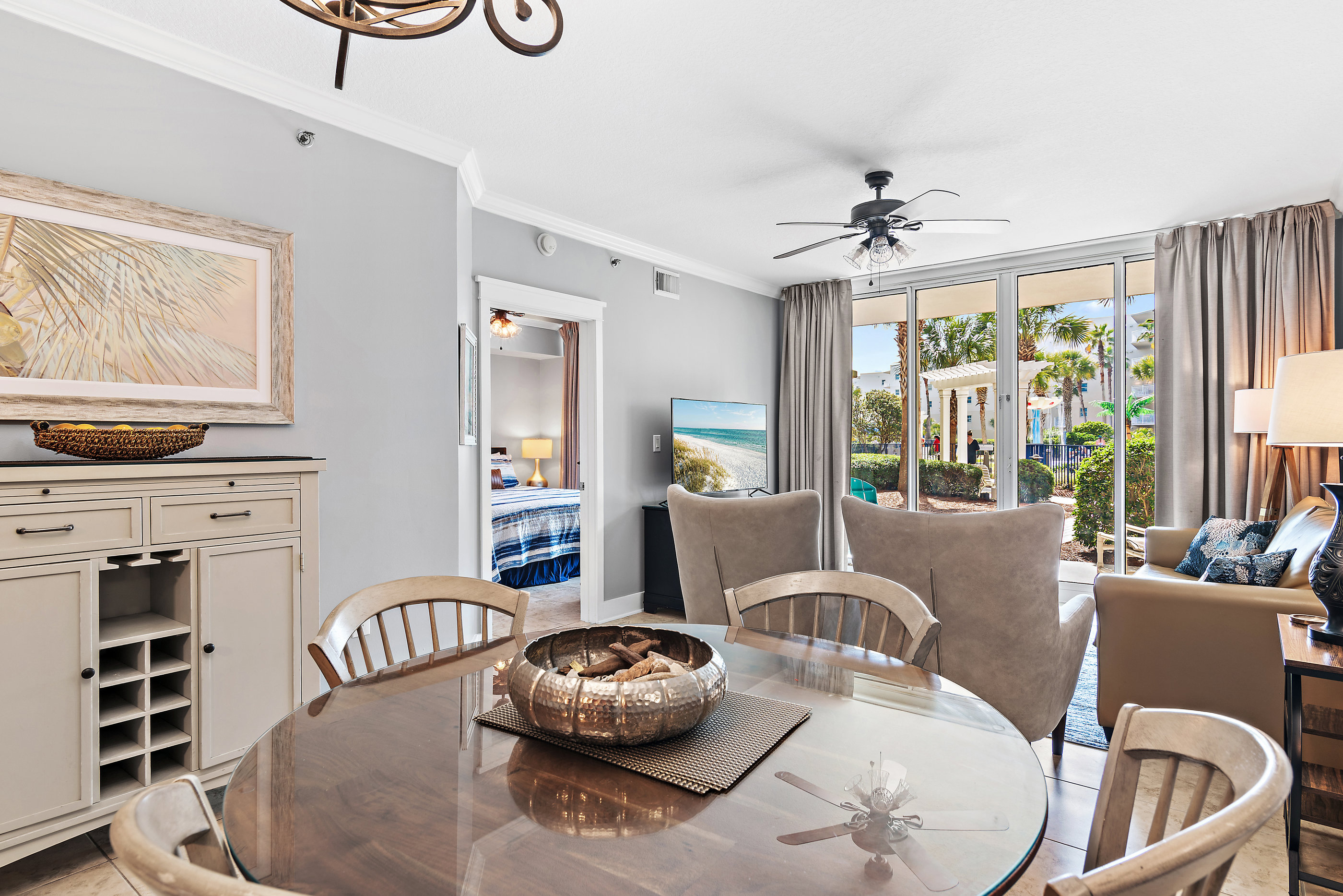 Village of Baytowne Wharf Studio at Grand Sandestin Resort 2nd floor, free Wi-Fi and Resort Tram Access inside Sandestin Golf and Beach Resort. We are at the Sandestin entertainment area. We offer our own nicely decorated and very well maintained condo, Netflix subscription and beach chairs & umbrella. Studio has a King bed and a sofa, a kitchenette with microwave, kitchen sink and a mid size refrigerator together with a full bathroom and a large balcony overlooking courtyard and pools.