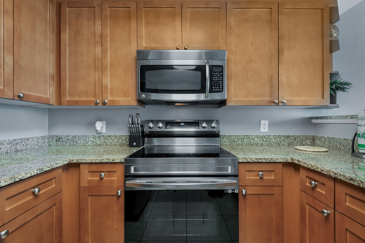 Fully equipped kitchen with granite countertops, stainless steel appliances, and tile floors