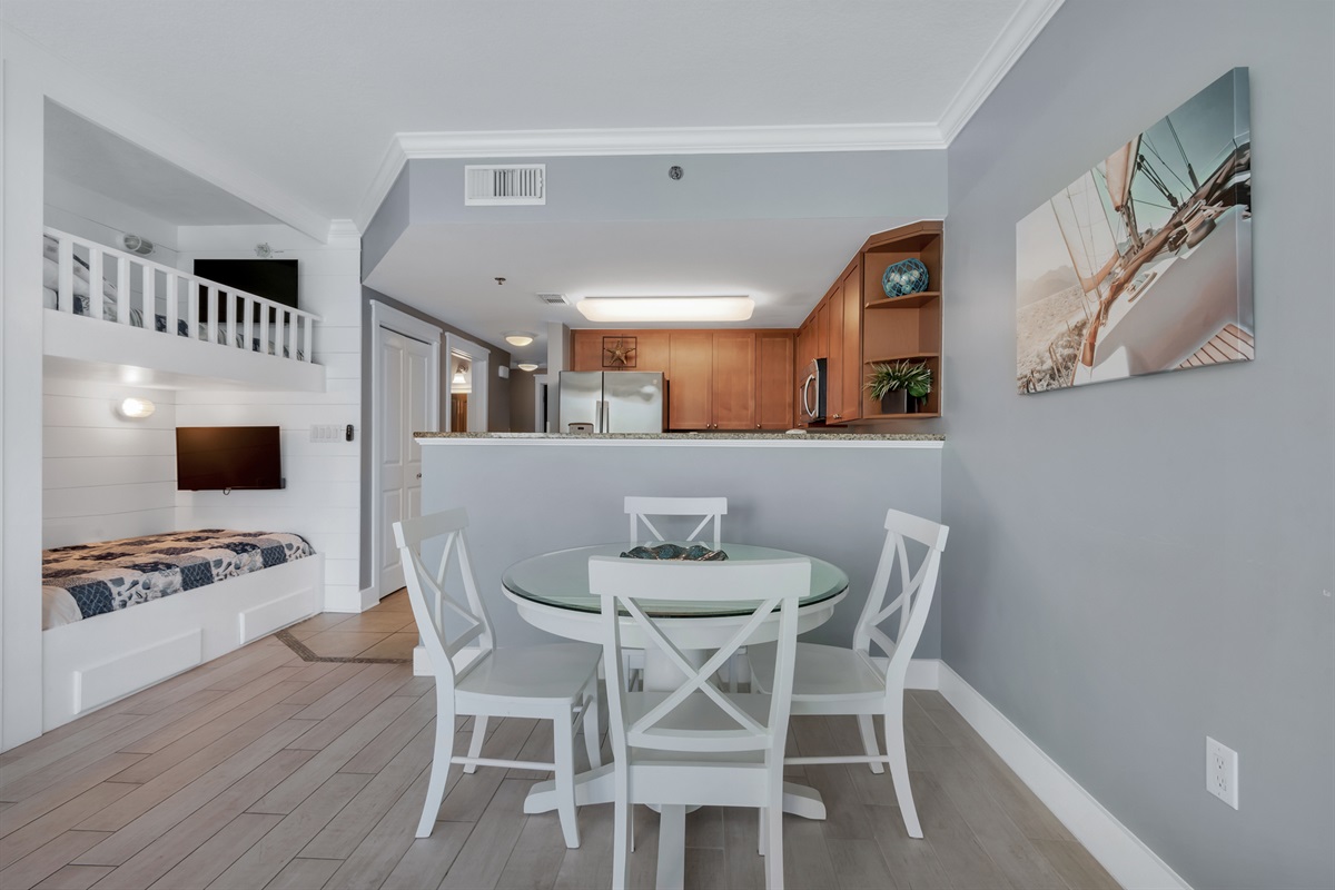 1 Bedroom • 2 Bathrooms 2 Baths • Sleeps 1-6Bright and beautifully updated 1BR/2BA condo on the 3rd floor at Waterscape Resort with new flooring and cheerful coastal décor. The master features a king bed and en-suite bath, while kids love the bunk beds with TVs. Also includes a sofa bed, stainless steel appliances, in-unit washer/dryer, and beach chairs with umbrella stored in the unit. Enjoy partial ocean and courtyard views plus top resort amenities like pools, a lazy river, and a waterfall. Guests return year after year!