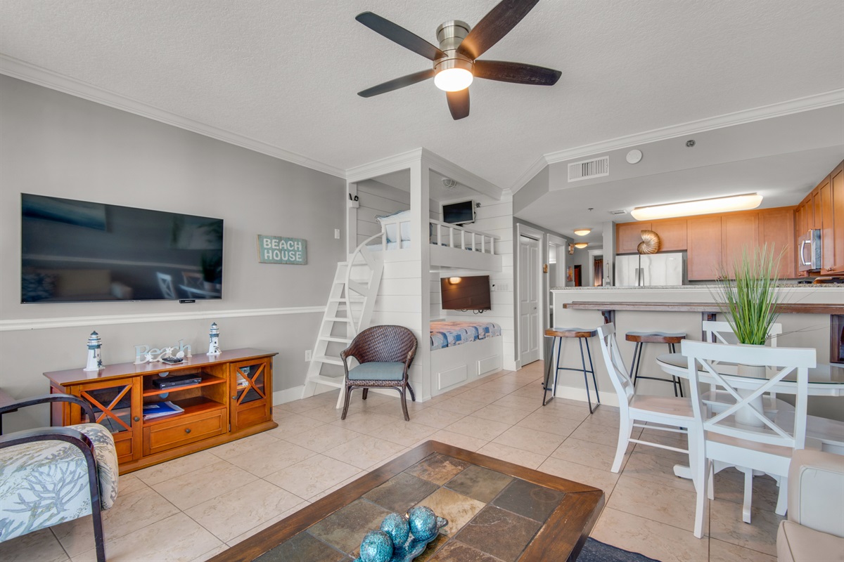 Sleeps 6 – King in master, built-in bunks with individual TV's, and queen sleeper sofa with memory foam